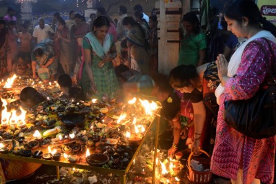 Devotees light lamps and perform rituals at temples near riverbanks.