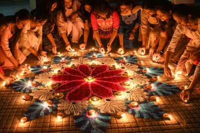 The festival is celebrated with Lakshmi Puja and lighting diyas in homes and temples.