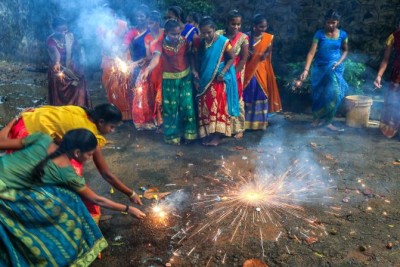 The festival begins with early morning oil baths, followed by Lakshmi Puja and bursting of crackers.