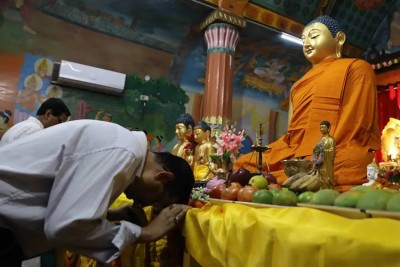 Devotees light lamps and offer prayers at Sarnath and Kushinagar, key sites linked to Buddha’s life.